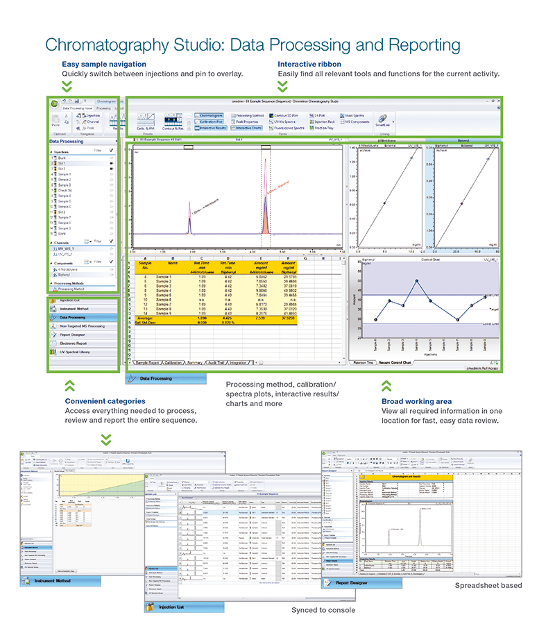 - Dynamic Data Processing — todas las selecciones y cambios se reflejan instantáneamente en los datos y resultados para todas las inyecciones de la secuencia, ahorrando tiempo